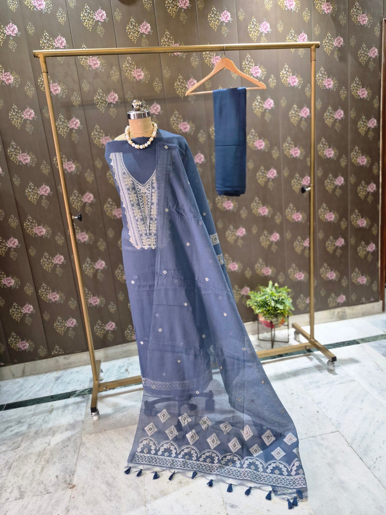 This Jamdani linen dress material offers comfort, style, and elegance in one ensemble, making it a perfect addition to your festive and occasion wear collection.