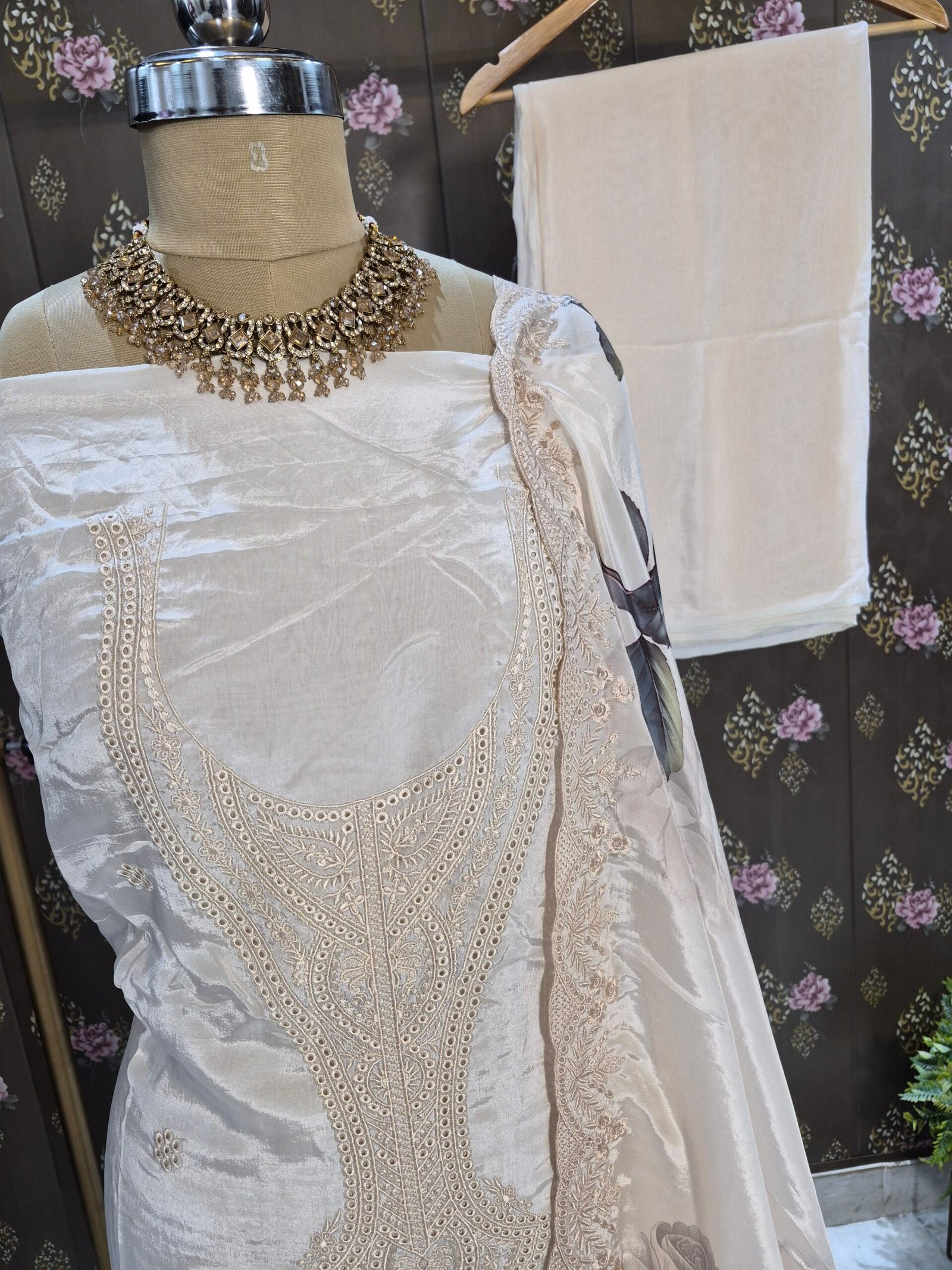 Grace meets sophistication in this premium off-white organza embroidered suit set, designed for women who love timeless elegance with a modern designer touch. The beautifully crafted organza shirt features delicate embroidery that enhances the soft, luxurious texture of the fabric, creating a refined and graceful silhouette.