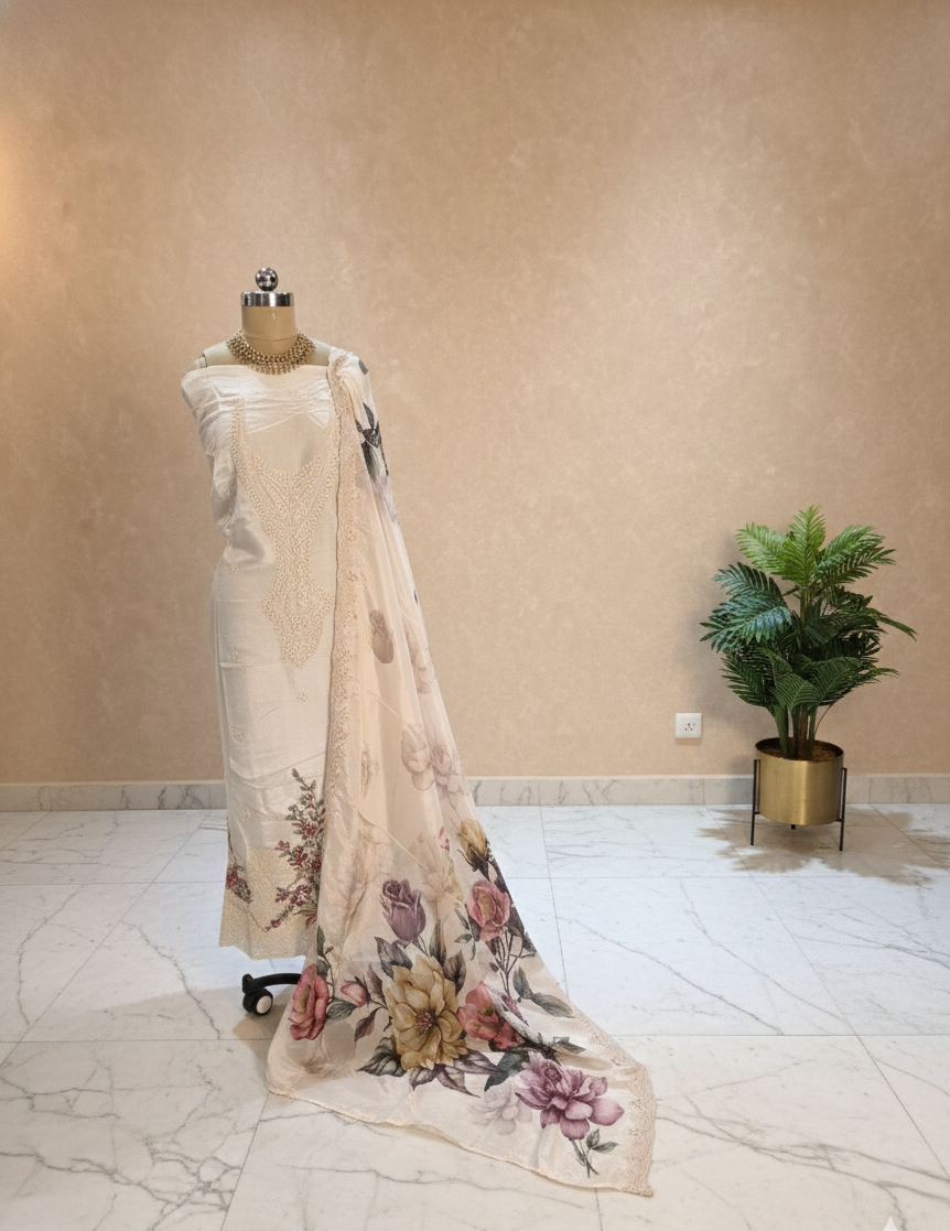 Paired with a stunning floral digital printed organza dupatta, this ensemble brings a soft romantic charm that makes it ideal for festive celebrations, wedding functions, and elegant evening gatherings. The shantoon bottom provides comfort, structure, and balance to the detailed top and flowy dupatta.