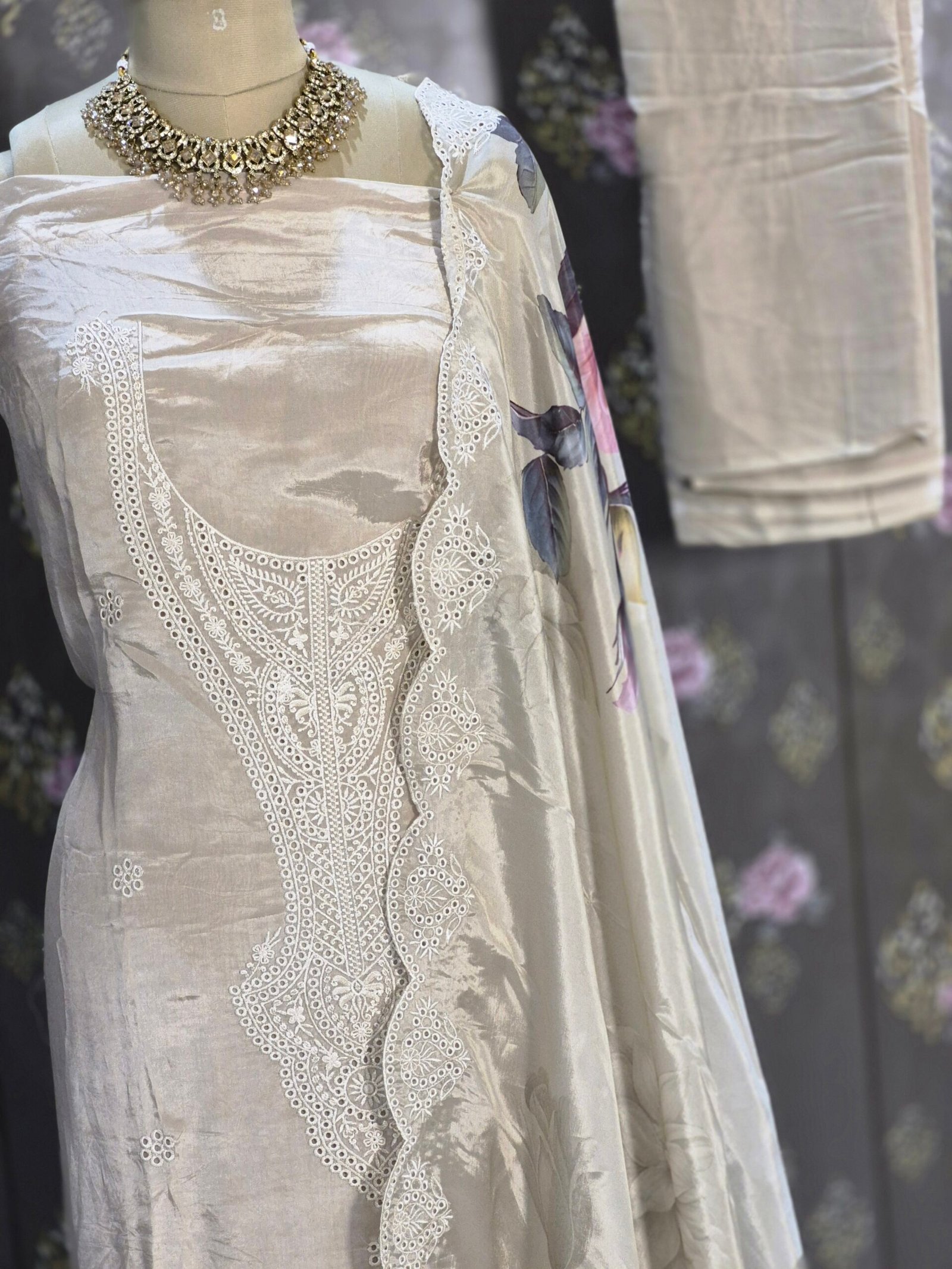 The delicate embroidery and subtle floral accents create a refined and sophisticated look, making it ideal for weddings, festive gatherings, evening events, and special occasions. The lightweight Ivory fabric adds a soft flow and premium fall, enhancing the overall silhouette.