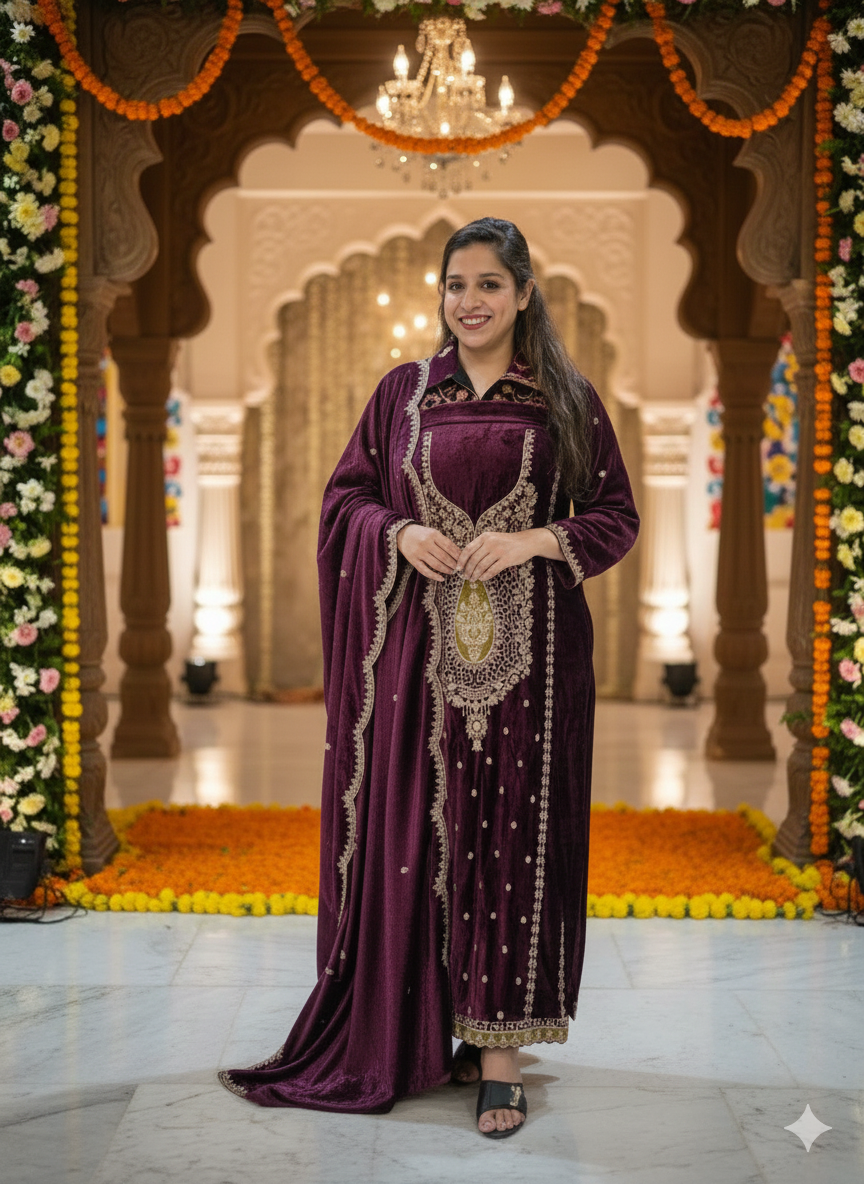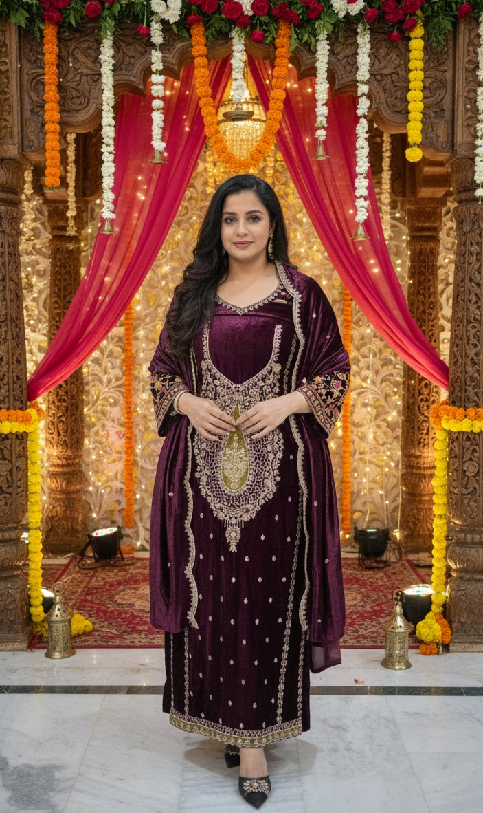 The suit features intricate embroidery with delicate detailing that enhances its regal appeal, while the matching velvet dupatta adds fluidity and grace to the silhouette. Perfect for weddings, festive gatherings, and winter soirées, this piece reflects refined craftsmanship rooted in tradition.